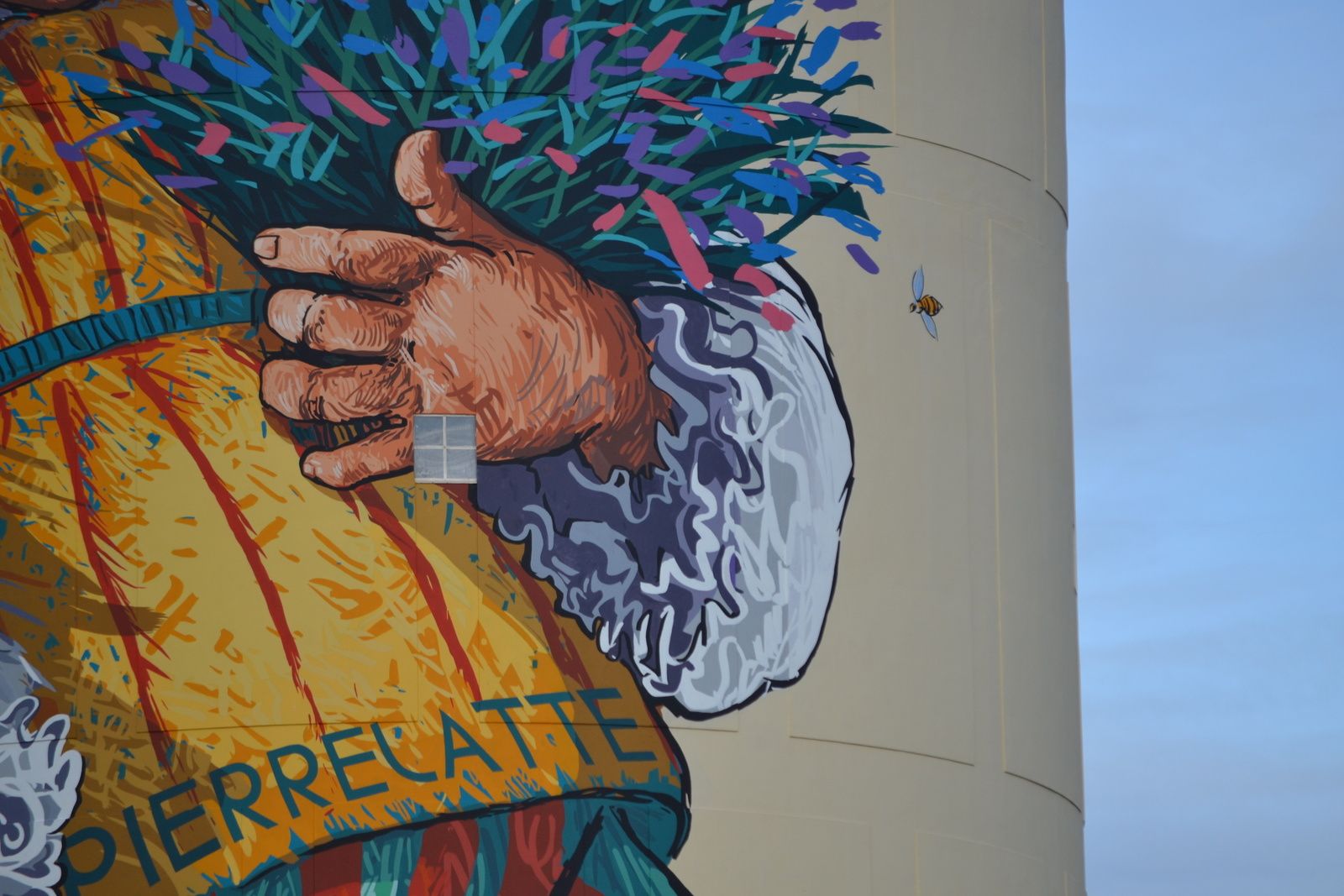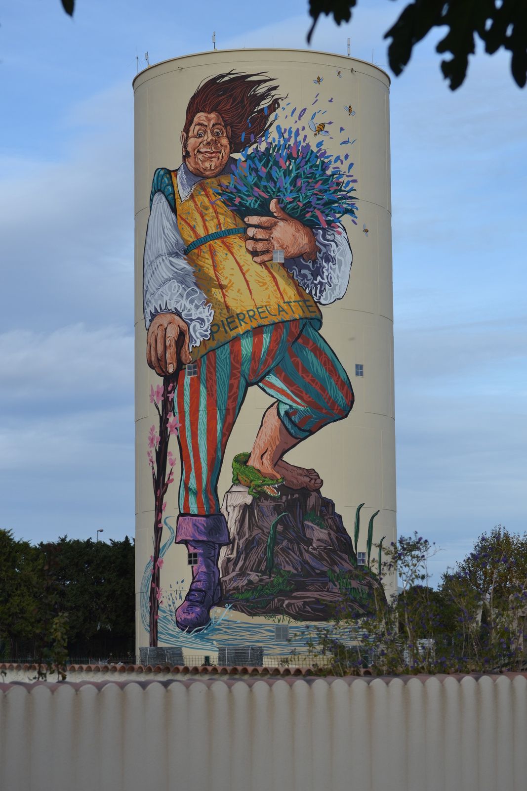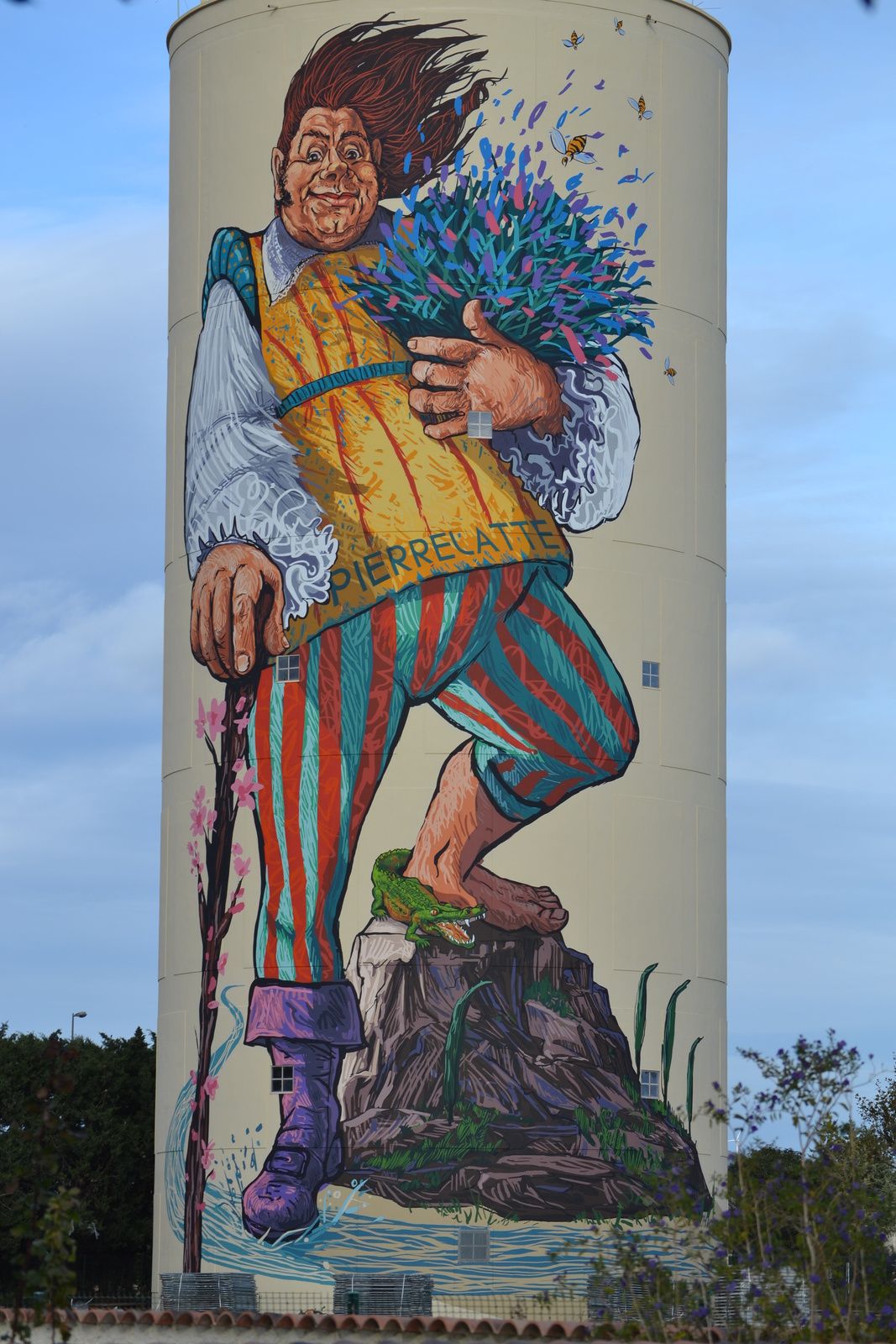 (01/11/2017) La fresque est terminée, les artistes peintres sont partis, l'échafaudage est démonté, il est là dans toute sa splendeur, ne reste plus qu'a connaître l'histoire de ce géant...histoire de ce géant détournée et prise en compte par la ville de Pierrelatte pour créer la légende de ce rocher, petite colline, au centre de la ville située dans la plaine de la vallée du Rhône. Il vient au monde en réclamant à boire, ce qui lui vaut l’imposition de son nom : Gargantua (« Que (gosier) grand tu as »). L'histoire de Gargantua rapportée par "http://www.maxicours.com/se/fiche/6/9/370869.html" lien en bas de cette page.