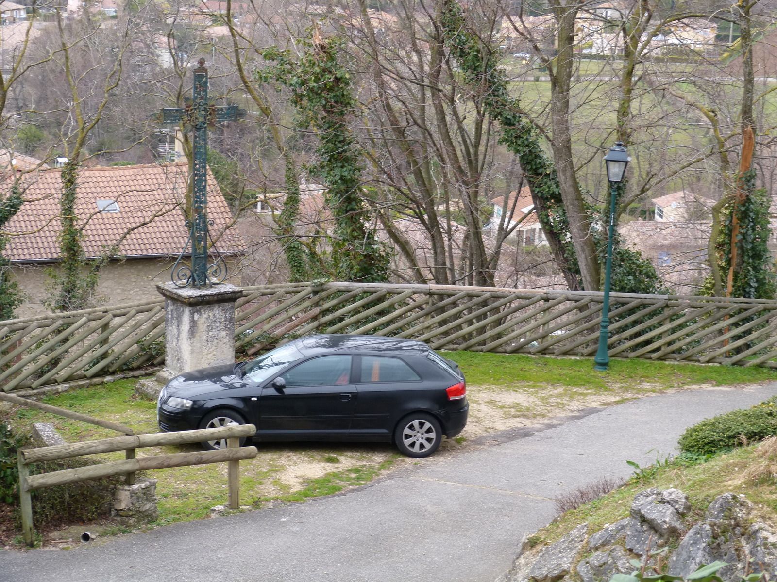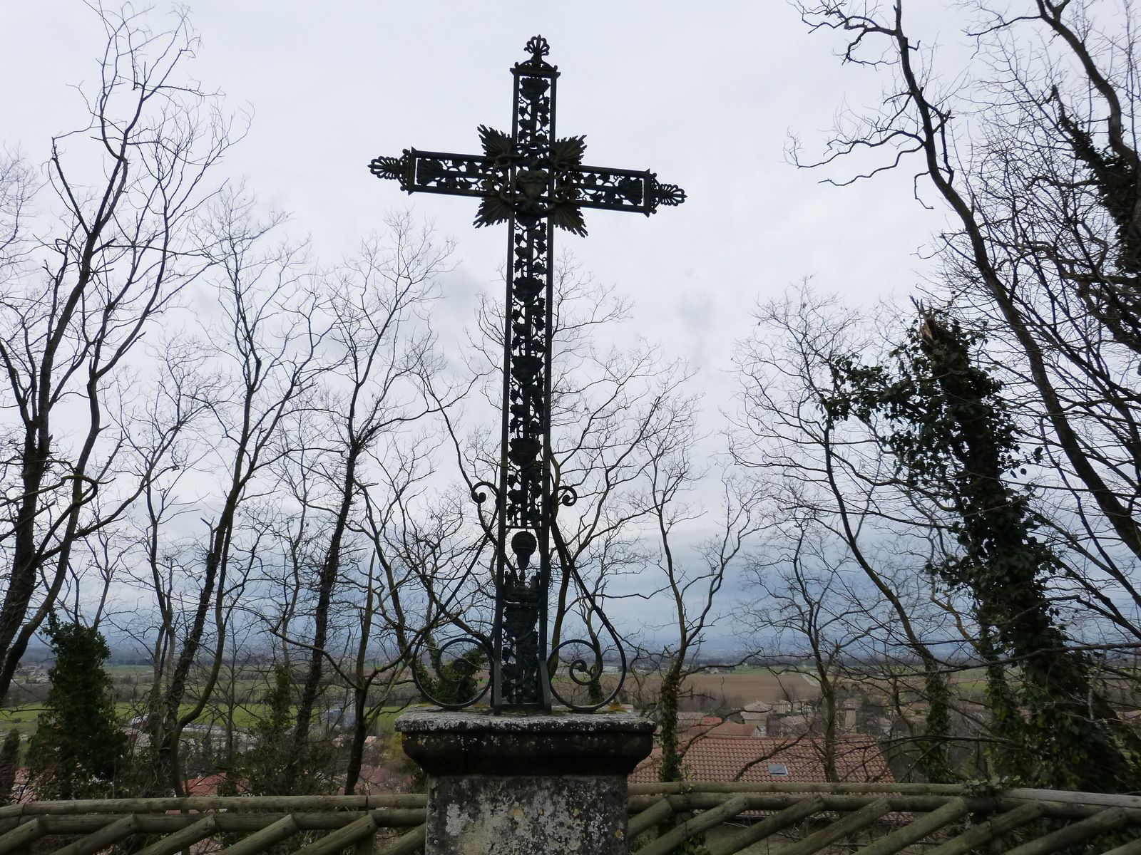 Un calvaire prés de l'église Saint-Nicolas, perchée en haut du village sur l'ancienne motte castrale, une petite place pour me garer, de vouloir trop m'approcher j'ai pris quelques risques dans ce petit village pittoresque et circulaire aux ruelles étroites, si étroites que j'ai failli y laisser rétroviseur et aile de la voiture.