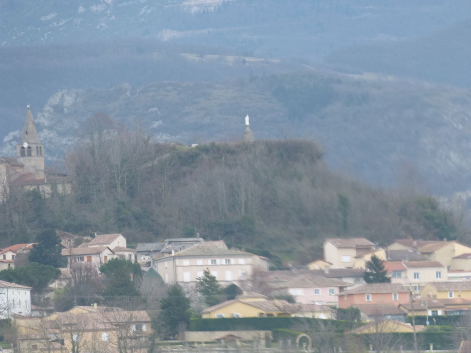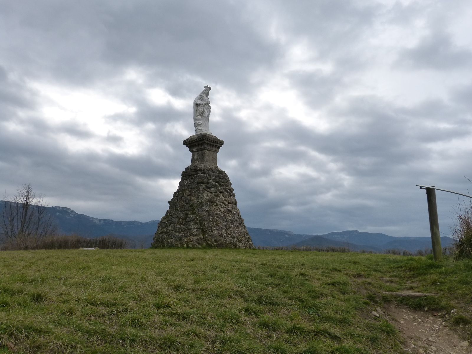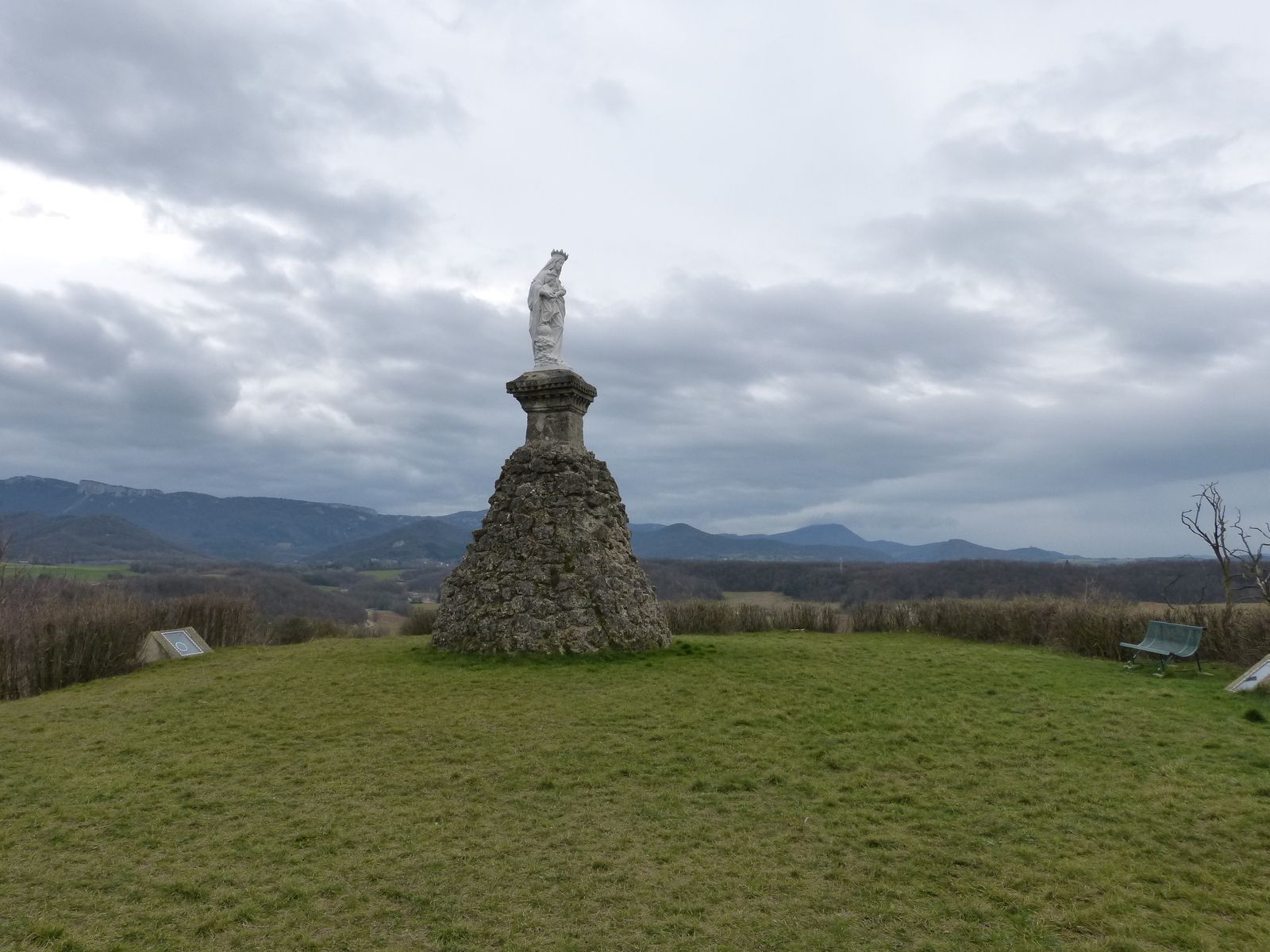 (17/02/2020) Après la vierge de Saint-Didier-Charpey, place à la suivant en l'occurrence la Vierge du vœu de Charpey, visible sur la colline qui domine le village, à l'emplacement d'un ancien château. Le ciel est loin d'être bleu azur comme souvent dans notre région, mais je n'ai pas vraiment choisi la couleur du ciel et le train en gare de Valence proche d'ici ou je dois me rendre en début d'après midi se fout pas mal du climat...