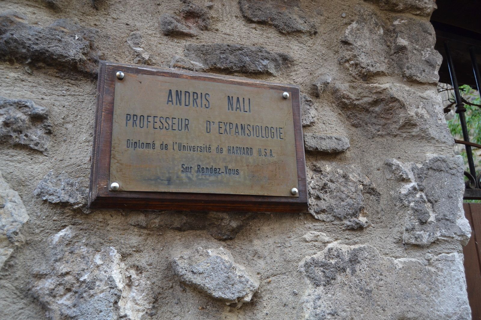 Poursuivant notre ballade dans le village, nous croisons cette fois ci une seconde plaque, genre plaque de médecin au nom de Andris Nali, personnage étrange la aussi puisque diplômé de l'université d'Harvard USA...