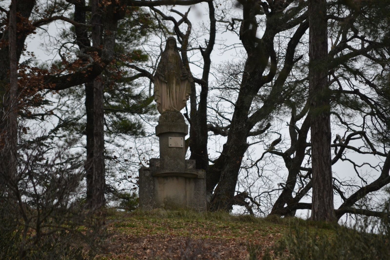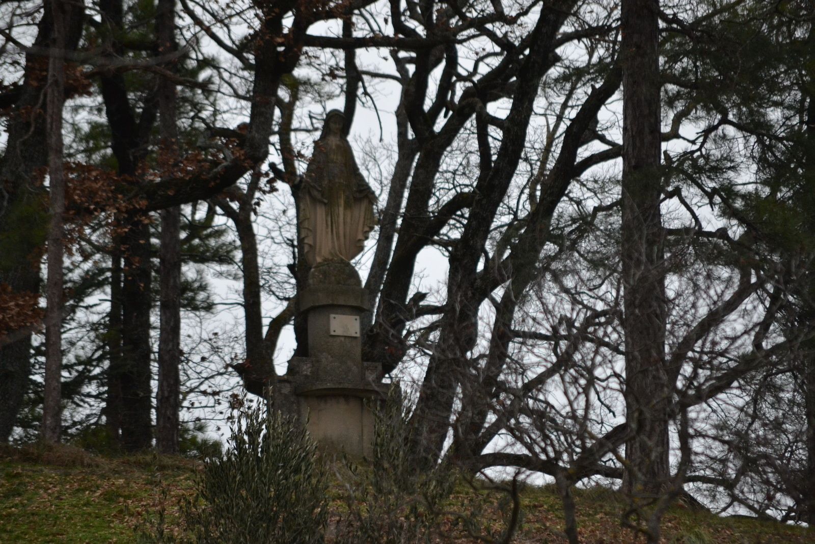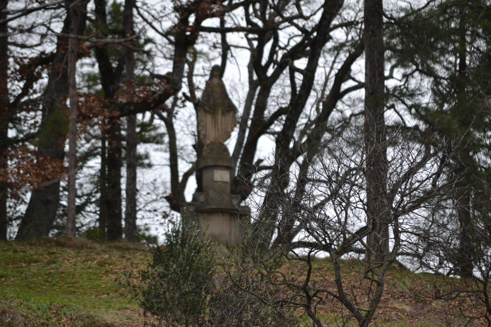 (06/01/2019) Insaisissable vierge du vœu de La Répara-Auriples calée sur un monticule au beau milieu d'un terrain privé et donc inabordable. J'aurais bien eu l'audace de demander l'autorisation d'entrer en sonnant chez les proprios, mais vu l'heure, environ 13h00, et le nombre de voitures garées devant la maison cela n'aurait vraiment pas été convenable de ma part de déranger un repas de famille pour la seule raison de prendre des photos...une autre fois peut être, j'allais oublié les chiens qui m'avaient l'air aussi "très accueillant".