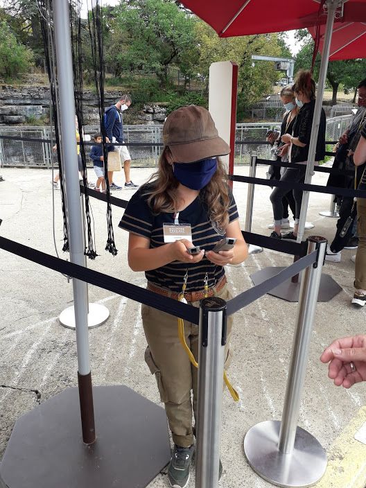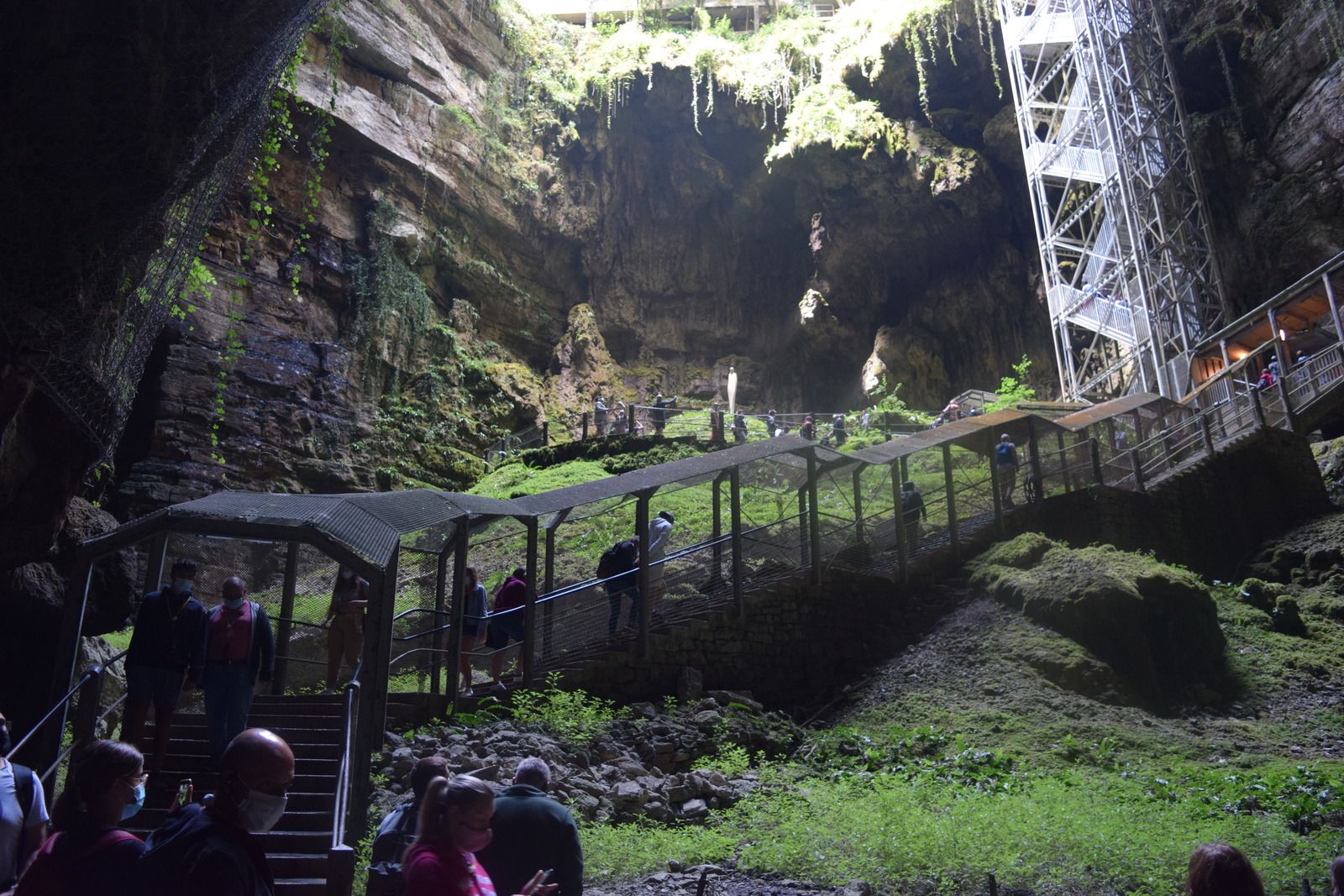 Port du masque obligatoire, sens de circulation, désinfection systématique des audioguides, gel a disposition, nous nous dirigeons vers l'immense escalier métalliques qui nous amène au fond de la partie visible du gouffre.